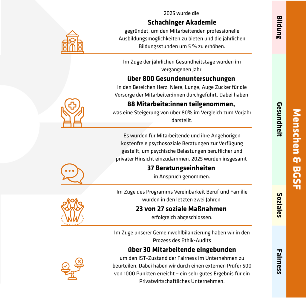 Wir fördern Gesundheit, Fairness und Chancengleichheit – ausgezeichnet durch das Gütesiegel Audit berufundfamilie (erstmalig 2024) sowie das BGF-Gütesiegel (bereits in der vierten Periode). Mit Angeboten wie kostenfreies Mental-Coaching über Mavie Work, regelmäßigen Gesundheitstagen und vielfältigen Arbeitszeitmodellen stärken wir das Wohlbefinden unserer Mitarbeitenden. Eine gelebte Kultur der Vielfalt, barrierefreie Kommunikation und Weiterbildungsmöglichkeiten unterstützen persönliche Entwicklung und soziale Teilhabe. Mehr Infos dazu im Nachhaltigkeitsbericht auf Seite 29 – 42.